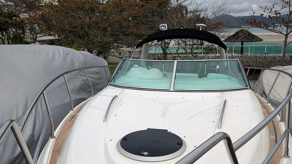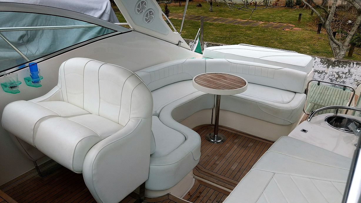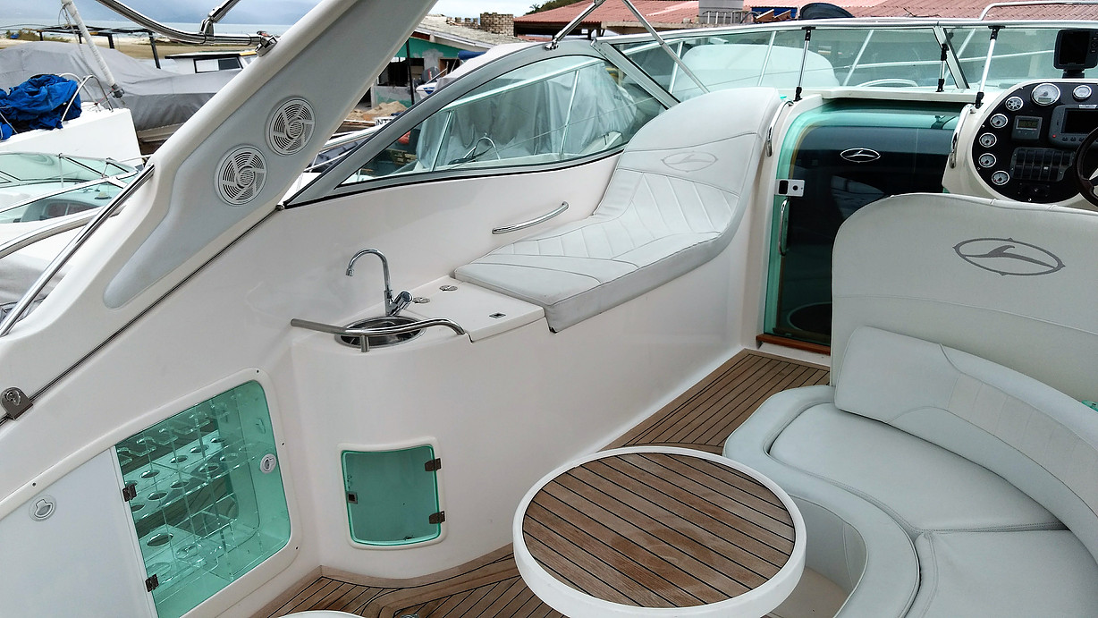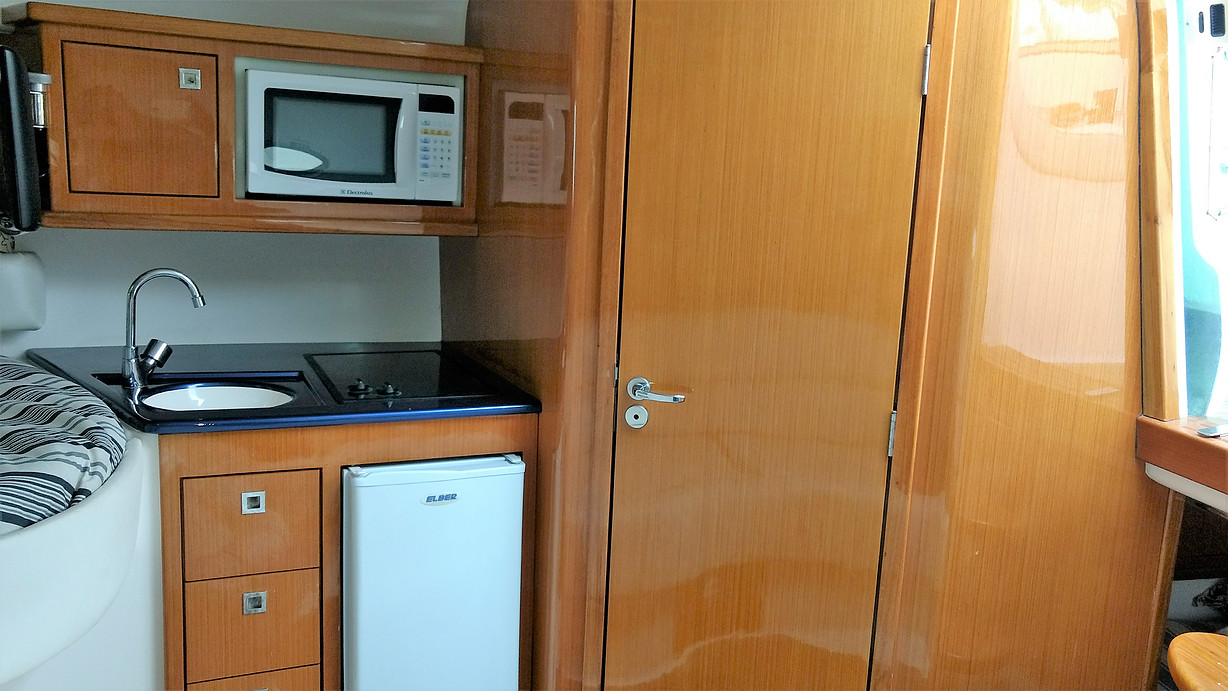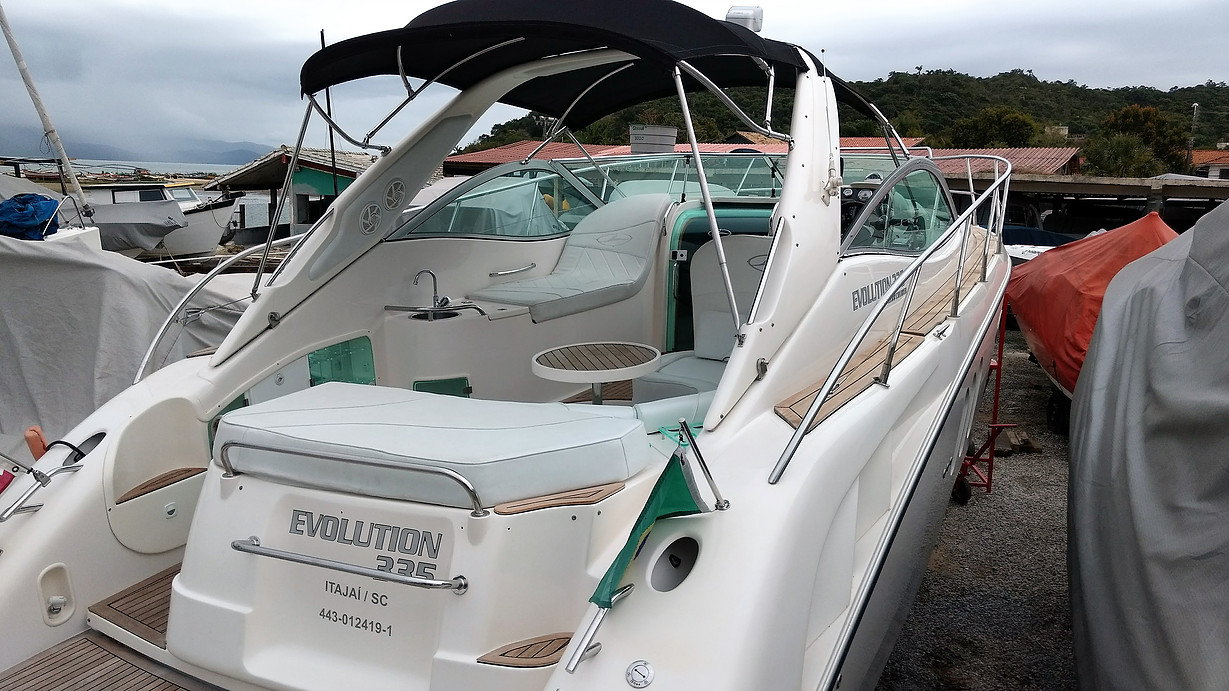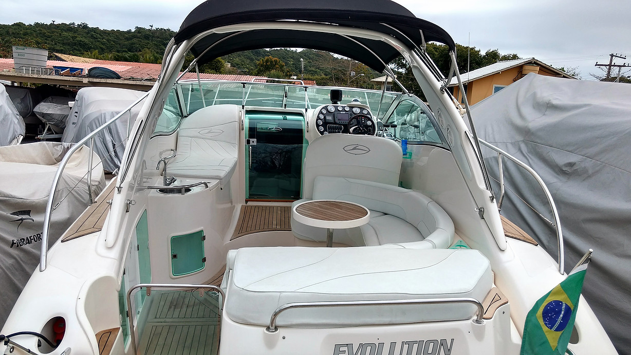 Fabricada em Florianópolis, esta embarcação com 34 pés e acabamento impecável é um sonho de consumo para quem pode. Sua suíte luxuosa abriga quatro pessoas para pernoite com conforto e tem ar-condicionado. Sob o chão da lancha, feito de madeira importada da Indonésia, 14 privilegiados podem passear durante 20 horas seguidas sem necessidade de abastecer — o tanque tem capacidade para 700 litros de combustível. Se a fome bater e a terra firme estiver longe, não há problemas: como se não bastasse uma cozinha equipada com microondas, fogão e geladeira, a Evolution vem com uma churrasqueira portátil.